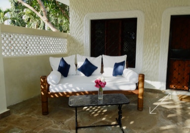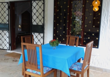 We offer you self-catering accommodation with breakfast included in a private cottage. You may chose between a one-bedroom or a two bedroom cottage when coming with family or friends. Centrally located in the heart of Diani, shopping facilities, bars and restaurants are within walking distance. The beautiful beach is easy accessible within a two minute walk on the footpath from our gate. Your cottage has a private verandah with a large Lamu daybed, a coffee table and a dining area, where your breakfast will be served in the morning.