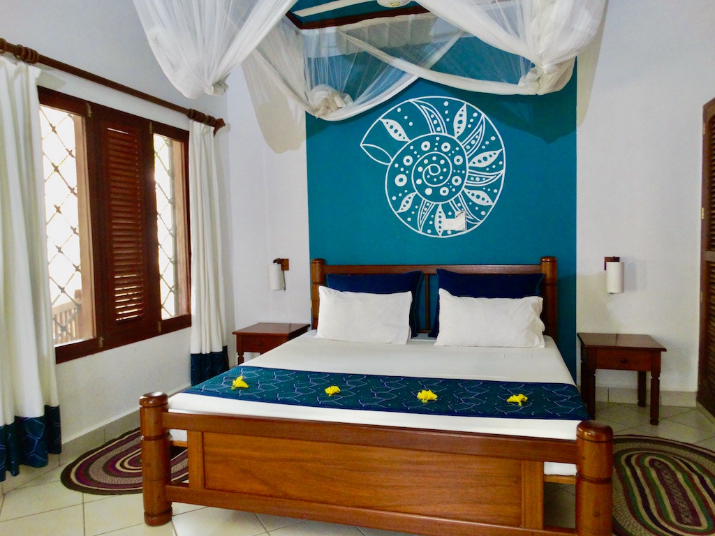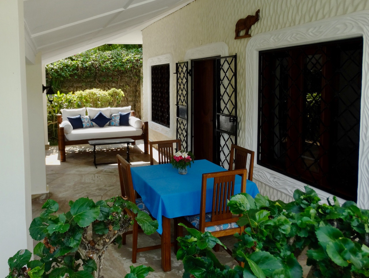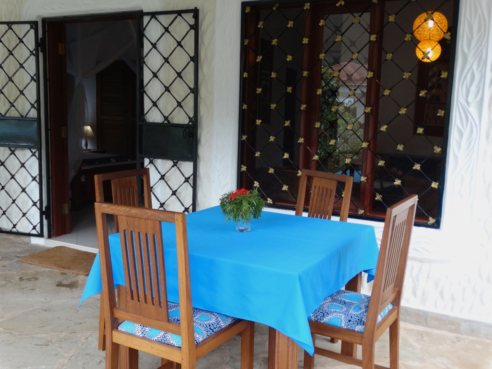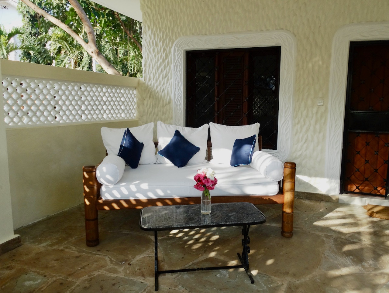 We offer you self-catering accommodation with breakfast included in a private cottage. You may chose between a one-bedroom or a two bedroom cottage when coming with family or friends. Centrally located in the heart of Diani, shopping facilities, bars and restaurants are within walking distance. The beautiful beach is easy accessible within a two minute walk on the footpath from our gate. Your cottage has a private verandah with a large Lamu daybed, a coffee table and a dining area, where your breakfast will be served in the morning.